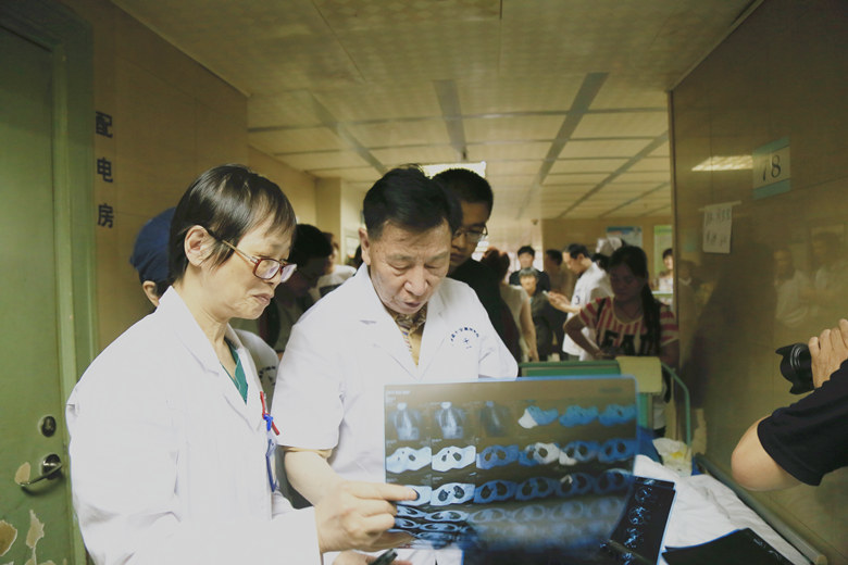 唐鎮(zhèn)生和李魯萍醫(yī)生認真查看小男孩的頭顱片子