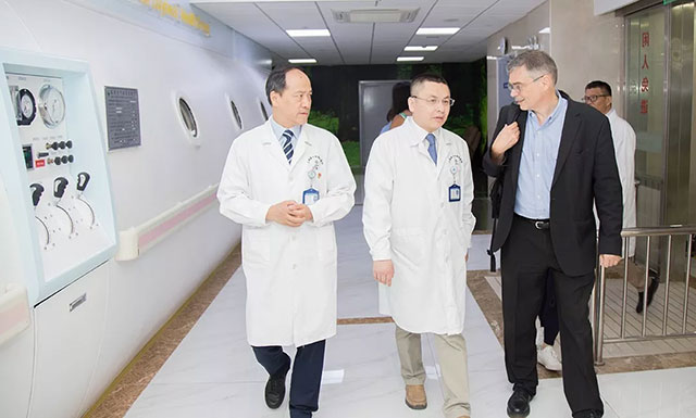 Andreas Heinz教授一行首先參觀了醫(yī)院手術(shù)室。隨后,深入ICU重癥監(jiān)護(hù)病區(qū)、腦血管病區(qū)、神經(jīng)外科、康復(fù)科、高壓氧科、醫(yī)學(xué)影像科、DSA介入科及放療科等特色科室進(jìn)行考察。