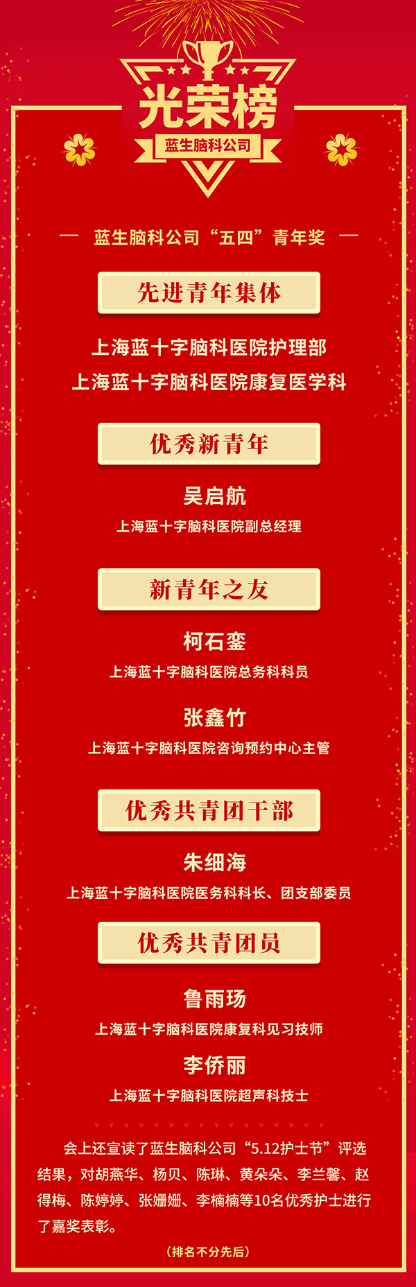 上海藍十字腦科醫(yī)院喜獲多項先進集體和優(yōu)秀個人榮譽表彰。自立院以來,醫(yī)院始終堅持以習(xí)近平新時代中國特色社會主義思想為指導(dǎo),堅持黨建統(tǒng)領(lǐng)促發(fā)展,工團聯(lián)動齊發(fā)力的工作新格局,切實提高政治站位,真正將黨建優(yōu)勢轉(zhuǎn)化為創(chuàng)新優(yōu)勢、競爭優(yōu)勢和發(fā)展優(yōu)勢,形成推動醫(yī)院高質(zhì)量發(fā)展的強大合力,為公司品牌化、連鎖化發(fā)展注入“新勢能”。