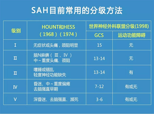 自發(fā)性蛛網(wǎng)膜下腔出血以臨床表現(xiàn)、體征及影像檢查為主要的診斷依據(jù),而影像檢查中腦血管造影(DSA)是診斷自發(fā)性SAH的金標(biāo)準(zhǔn)。為了更好的進(jìn)行診療、評(píng)估手術(shù)風(fēng)險(xiǎn)和預(yù)后,對(duì)SAH進(jìn)行了臨床分級(jí),可以提高預(yù)后預(yù)測(cè)的精準(zhǔn)性和醫(yī)生對(duì)病情變化的預(yù)見性, 通過分析預(yù)后相關(guān)因素進(jìn)一步完善治療方案,加強(qiáng)對(duì)不利因素的控制,改善患者的預(yù)后。