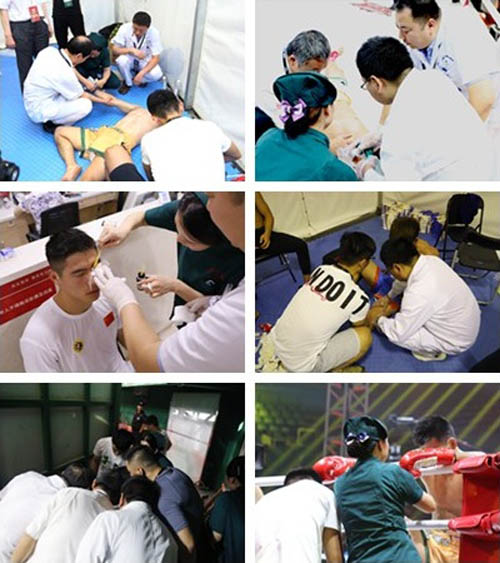 整個賽事21場比賽,不斷有選手眉弓、嘴角、鼻子等處外傷、血流不止,上海藍(lán)十字腦科醫(yī)院醫(yī)療急救保障隊(duì)醫(yī)務(wù)人員充分發(fā)揮優(yōu)良的應(yīng)急醫(yī)療救治能力,全力迅速地采取及時有效的急救措施,共救治傷員10名,通過急診綠色通道送醫(yī)院救治傷員2名,確保了參賽選手的健康與安全,從而有力、有效地保障了本次散打賽事的順利進(jìn)行。出色的表現(xiàn)和優(yōu)良的醫(yī)技能力,贏得了賽事組委會、參賽選手和觀眾的認(rèn)可與贊賞。