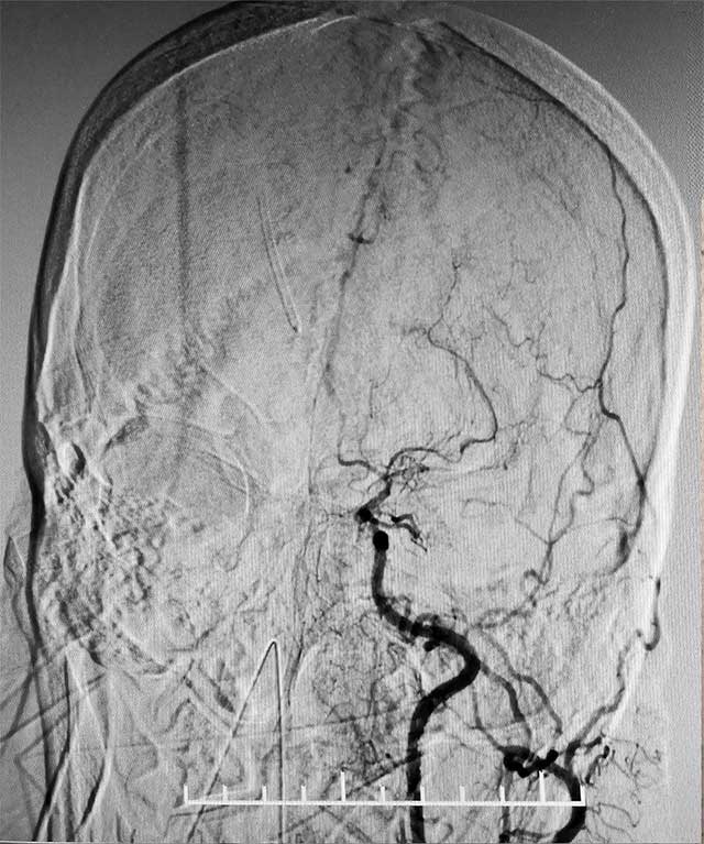 張琪博士在劉春醫(yī)生和周林華醫(yī)生協(xié)助下,在顯微鏡下將顱外顳淺動(dòng)脈游離后引入顱內(nèi),與大腦中動(dòng)脈分支行端側(cè)吻合。由于吻合血管直徑僅1mm左右,手術(shù)中在顯微鏡下使用僅有頭發(fā)絲直徑1/3的縫合線(10-0線)將吻合口縫合12針,才最終保證吻合口通暢并且無漏血。同時(shí),進(jìn)行硬腦膜翻轉(zhuǎn)術(shù)。隨后在復(fù)合手術(shù)室環(huán)境下,進(jìn)行腦血管造影,顯示搭橋血管血流通暢,頸動(dòng)脈血流通暢,頸外動(dòng)脈造影見顳淺動(dòng)脈血流向受體動(dòng)脈兩端供血,搭橋手術(shù)成功,整個(gè)手術(shù)過程持續(xù)了5個(gè)多小時(shí)。