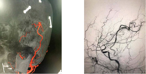 經(jīng)腦血管CTA和DSA檢查,結(jié)果顯示,患者雙側(cè)頸內(nèi)動(dòng)脈末端閉塞,左側(cè)大腦中動(dòng)脈閉塞,顱內(nèi)煙霧狀血管形成,左側(cè)顳頂枕葉灌注不足明顯,顱底出現(xiàn)細(xì)如煙霧的代償血管網(wǎng)絡(luò),腦部供血嚴(yán)重不足。結(jié)合病史,患者部被確診為煙霧病,由于代償血管壁長期受到異常血流沖擊,形成動(dòng)脈瘤導(dǎo)致腦出血。張琪博士決定為其實(shí)施復(fù)合手術(shù)室下顱內(nèi)外血管搭橋聯(lián)合硬腦膜翻手術(shù)。由于患者腦血流非常薄弱,任何風(fēng)吹草動(dòng),都有可能出現(xiàn)腦梗、腦出血。另外,在手術(shù)過程中,在全身麻醉狀態(tài)下,可能出現(xiàn)血壓降低,造成腦梗。所有這些無疑增加了手術(shù)難度和風(fēng)險(xiǎn)。