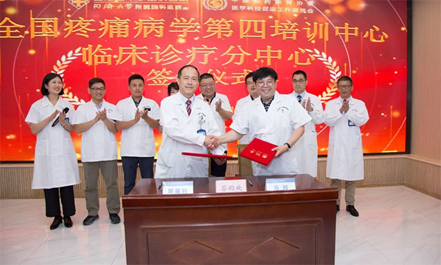 隨后,院領導和馬柯教授專家團隊共同為全國疼痛病學第四訓中心臨床診療分中心成立揭牌。項耀鈞院長代表醫(yī)院與馬柯教授簽署了醫(yī)院成立該中心的協(xié)議。