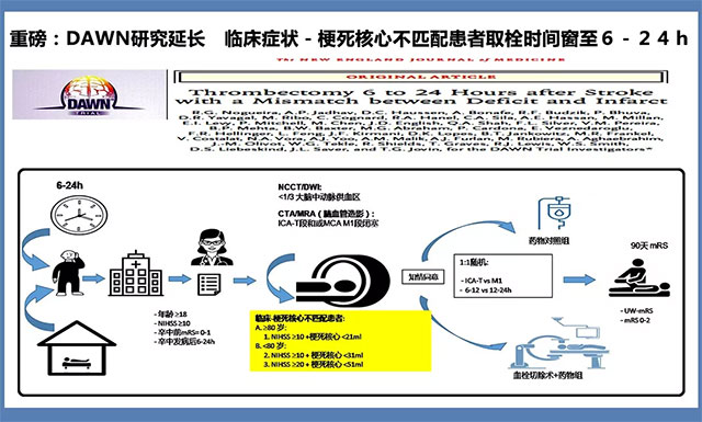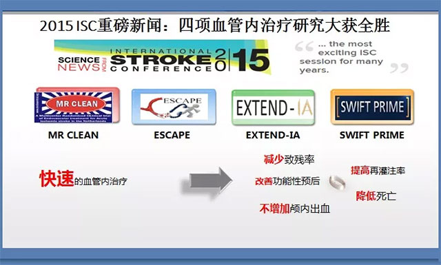 2015年國際卒中大會上,四項(xiàng)血管內(nèi)治療研究(MR CLEAN研究、ESCAPE研究、EXTEND-IA研究、SWIFT PRIME研究)已擴(kuò)大了治療時(shí)間窗。這些研究表明,在具備影像學(xué)評價(jià)存在組織窗的前提下,血管內(nèi)治療可取得良好的臨床獲益,可顯著提高再灌注率、減少致殘率及死亡率、改善功能性預(yù)后,且不增加顱內(nèi)出血。