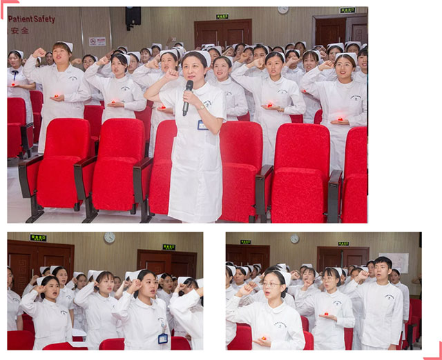 “我宣誓:志愿獻身護理事業(yè)...堅定救死扶傷的信念...燃燒自己,照亮他人,把畢生精力奉獻給護理事業(yè)...”全場紅燭閃動,氣氛神圣莊重,在副院長周詠梅領(lǐng)誓下,新護士舉起右手,莊嚴地宣誓。鏗鏘有力的宣誓聲響徹全場,承載著新護士背負起救死扶傷使命的承諾,從此,他們將踏上新的征程,忠貞職守,終其一生,成為護理戰(zhàn)線上朝氣蓬勃的生力軍。
