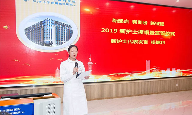 新護士代表楊健利表示,在藍十字腦科實習(xí)期間,收獲了溫暖、感動與成長。她將許多的“第一次”娓娓敘述,比如第一次面對昏迷患者血壓驟升突發(fā)事件的無措,第一次為患者做鼻飼的緊張不安,第一次收到患者感謝信的感動...她說,“今天,接過前輩手中的蠟燭,被授予圣潔的燕尾帽,正式成為一名白衣天使,從此對生命有了一種更為神圣而光榮的使命感,我將繼續(xù)努力,以實際行動將南丁格爾精神傳承。”