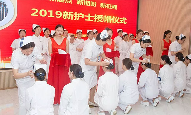 授帽儀式是每位新護士踏上護理道路的成人禮,是每位新護士正式成為一名白衣天使的象征。伴隨著莊嚴的樂曲,85名新護士身著潔白的護士服列隊依次上臺,深深鞠躬后,屈膝半蹲在護理前輩面前。醫(yī)療管理部護理總監(jiān)唐秀花,副院長郭俊艷、周詠梅,護士長張秀娟為新護士一一戴上圣潔的燕尾帽,并鼓勵她們立足崗位,傳承護理事業(yè)光芒,無私奉獻,堅定信念,用愛心、耐心、責(zé)任心關(guān)愛每一位患者,為他們提供優(yōu)質(zhì)、低耗、溫馨的護理服務(wù)。