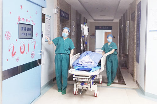 身著深綠色的工作服,姑娘頭戴鮮亮的護(hù)士帽,這些顏色在雪白的病房是生命的象征,是溫暖的象征,是病人心中生機(jī)勃勃的希望。病房大門上貼著紅色的窗花,綠樹下灑下他們新年的期盼,也寄托著患者和家屬對他們的感謝和祝福。ICU是死神之手常常觸碰的地方,這里是沒有硝煙的戰(zhàn)場,李魯萍主任和她的團(tuán)隊(duì)用大醫(yī)精誠的擔(dān)當(dāng),用白衣天使的溫柔,將風(fēng)霜雪雨變成春暖花開。
