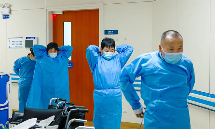 15:10 現(xiàn)場處置人員穿戴好一次性隔離衣、手套、口罩、靴子、帽子、防護(hù)面屏等防護(hù)用品,再行醫(yī)廢收集轉(zhuǎn)運(yùn)。