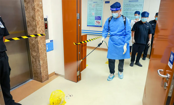 ▲ 保潔人員進(jìn)行地面消毒、清潔