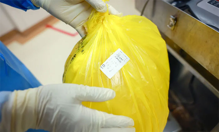 15:43 由兩名保潔對(duì)溢出、散落的損傷性醫(yī)療廢物迅速進(jìn)行收集、清理和消毒處理,按照損傷性醫(yī)廢收集方法,用鑷子重新收集到銳器盒內(nèi)后,再進(jìn)行醫(yī)廢包裝袋盛裝,采用鵝頸結(jié)式封口,對(duì)包裝袋表面采用1000mg/L含氯消毒液噴灑消毒后再加套一層醫(yī)廢包裝袋。醫(yī)廢專員重新粘貼好標(biāo)簽,裝入專用醫(yī)療廢物轉(zhuǎn)運(yùn)車。