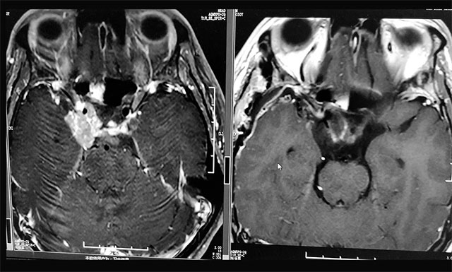患者蔡先生(化名)因持續(xù)頭痛、視力下降被查出是垂體無功能巨大腺瘤,腫瘤大小超過3cm。在杭州一家醫(yī)院做了經(jīng)蝶竇垂體瘤切除手術(shù)后,由于術(shù)后腫瘤殘余較多,出現(xiàn)頭痛情況,視力較術(shù)前未見明顯改觀,左側(cè)視力0.12,右側(cè)視力0.1。后慕名來到上海藍(lán)十字腦科醫(yī)院。