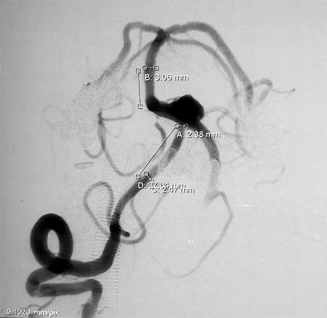 先向瘤體內(nèi)稀疏填入一枚彈簧圈,隨后釋放支架至覆蓋瘤頸,隨后通過(guò)支架網(wǎng)孔繼續(xù)向瘤腔內(nèi)填入數(shù)枚彈簧圈,再次造影見(jiàn)大部分瘤體不顯影。但子瘤內(nèi)仍可見(jiàn)少量血流,通過(guò)支架導(dǎo)管再次釋放一枚支架覆蓋瘤頸,再次造影后見(jiàn)動(dòng)脈瘤無(wú)顯影,撤出系統(tǒng)后行血管造影,未見(jiàn)血栓形成,CT檢查無(wú)出血。