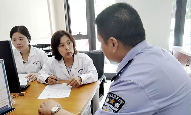 ▲ 疼痛門診醫(yī)生為民警作檢查和咨詢