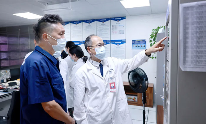 檢查組一行深入藥房、靜脈輸液集中配置室、消控室、設(shè)備機房、庫房、配電室、電梯間等重點場所,針對消防安全、醫(yī)療安全、設(shè)備運行、藥品管理、信息安全、后勤保障等關(guān)鍵環(huán)節(jié)進行全面排查。