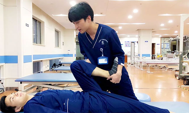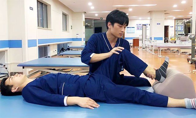 下列圖片中,上海藍(lán)十字腦科醫(yī)院神經(jīng)康復(fù)醫(yī)學(xué)科康復(fù)團(tuán)隊模擬演示brunnstrom療法。
