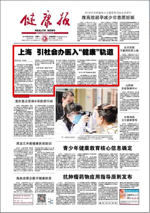 9月26日,作為國(guó)家衛(wèi)生健康委員會(huì)主管的最具影響的全國(guó)性衛(wèi)生行業(yè)報(bào)的《健康報(bào)》,在頭版頭條刊發(fā)了題為《上海 引社會(huì)辦醫(yī)入“健康”軌道》的文章,對(duì)最新出臺(tái)的上海“健康服務(wù)業(yè)50條”中的政策亮點(diǎn)予以重點(diǎn)關(guān)注和報(bào)道。
