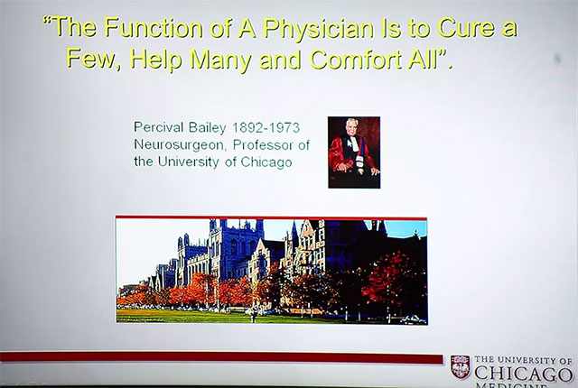 ▲ 譯文:芝加哥大學(xué)神經(jīng)外科醫(yī)生P.B.教授: 一位醫(yī)生的作用是治療好少數(shù)人,幫助多數(shù)人,安慰所有人。
