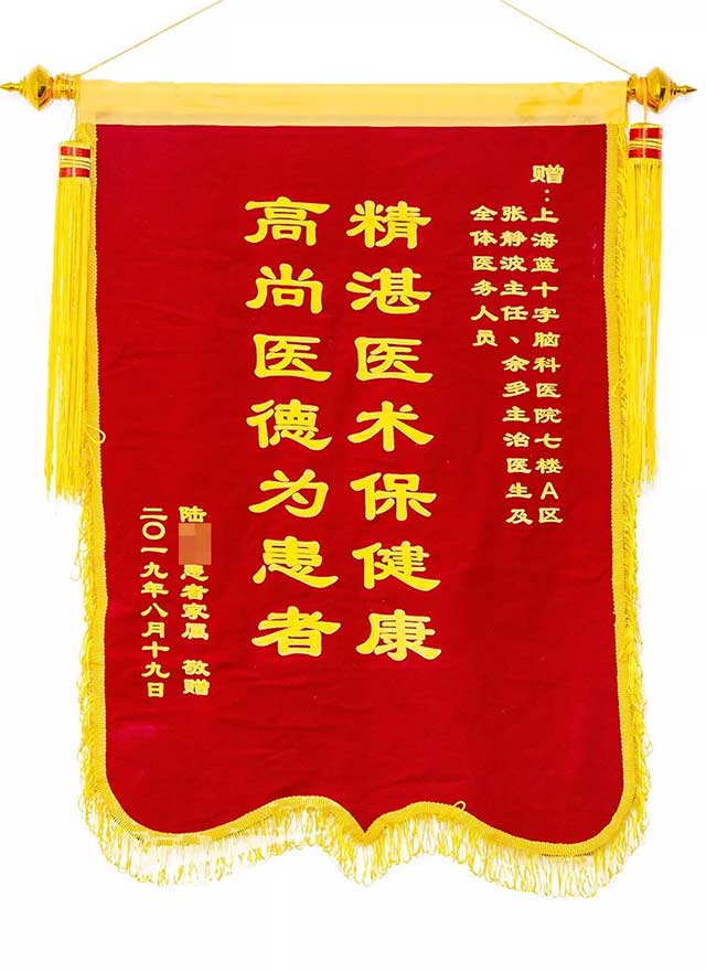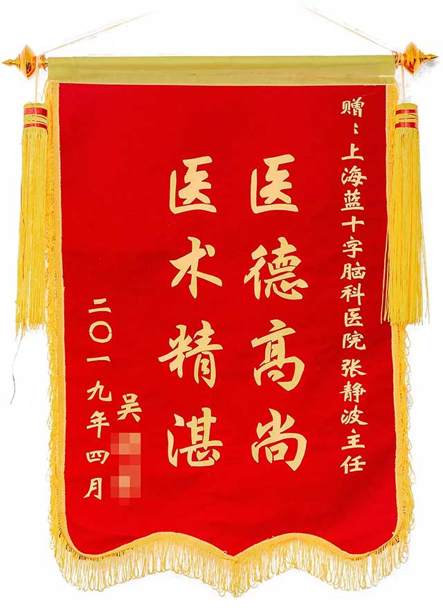 最后,今年3月其父慕名將他兒子轉(zhuǎn)診至上海藍(lán)十字腦科醫(yī)院,由王玉霞主任確診為“營養(yǎng)不良周圍神經(jīng)病變”,經(jīng)過張靜波主任和7A病區(qū)醫(yī)護(hù)人員悉心照料,經(jīng)過一個多月,該男生開始喝粥了,體力也逐漸恢復(fù),再過兩個月,該男生能下地走動了,自入院100天不到就順利出院了。他父親非常感激,連連送紅包給王玉霞和張靜波主任,被婉拒,出院那天送了兩面錦旗給這兩位主任,并一再邀請張靜波來寧波“旅游”亦被張靜波主任婉拒了。