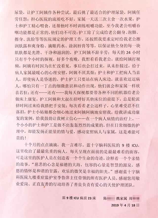 我還要說說李主任為首的團(tuán)隊(duì),這真的是一個(gè)可以信托的團(tuán)隊(duì),從主任到醫(yī)生、護(hù)士和護(hù)工,都是敬業(yè)、友善、有愛心的天使,善良熱誠(chéng),愿意耐心傾聽病人家屬的訴求,一切的治療和護(hù)理從病人實(shí)際出發(fā),盡量減少病人的痛苦、降低家屬的擔(dān)心度。病人康復(fù)出院了,家屬最想感激的就是醫(yī)生,而往往忽略了每天和病人接觸時(shí)間最多的護(hù)士和護(hù)工,經(jīng)歷了這里的十個(gè)月,我從心里發(fā)出感慨:藍(lán)十字的護(hù)士、護(hù)工不容易,9樓ICU的護(hù)士、護(hù)工更不容易,而作為我老公的管床護(hù)士和護(hù)工最不容易。病人導(dǎo)尿管拔了,怕他感染,我買了多種尿袋,讓護(hù)工阿姨作各種嘗試,最后挑了最適合的護(hù)理尿袋,阿姨任勞任怨;擔(dān)心醫(yī)院的流質(zhì)吃不好,家屬一天送三次主食一次水果,護(hù)士和護(hù)工精心喂食,還幫他時(shí)不時(shí)訓(xùn)練咀嚼功能,至今我老公咀嚼吞咽功能都是正常的,他們功不可沒:護(hù)工除了完成給老公翻身、泡腳、擦身、洗臉等等醫(yī)院規(guī)定的護(hù)理工作,還按照我要求定時(shí)給我老公擦潤(rùn)膚露和爽身粉、滴眼藥水、涂潤(rùn)唇膏等等,以保證他全身的每塊肌膚都是光滑、干凈和滋潤(rùn)的,護(hù)工阿姨不辭辛勞;每天的24小時(shí)只有半個(gè)小時(shí)的探視,好多個(gè)夜晚,我想看看我老公,就給阿姨打視頻,阿姨有時(shí)因?yàn)樵诿]看見,事后也會(huì)打過來,從未拒接過,給于病人家屬最暖心的心理安慰,阿姨不厭其煩;護(hù)士和護(hù)工把病人當(dāng)親人,即使病人是昏迷的,護(hù)士護(hù)工只要站在病人床邊,就喜歡逗逗病人,哪怕只有一丁點(diǎn)的細(xì)微意識(shí)和動(dòng)作出現(xiàn),他們就會(huì)和家屬一樣欣喜若狂;還有……還有……我每天探視都要帶各種不同的機(jī)器給老公做床上康復(fù),護(hù)工阿姨和大叔在招呼好其他床位的前提下,總是輪流擠時(shí)間過來給我搭把手安裝;每次看著老公這樣子,心里難受忍不住落淚,護(hù)士小姑娘都會(huì)細(xì)心地過來阿姨阿姨地安慰我,給我講成功康復(fù)的案例,給我鼓勁讓我樹立信心……在一個(gè)病人病情的治療上一個(gè)小小的護(hù)士和護(hù)工是做不出轟轟烈烈的成果的,但在日常細(xì)微的護(hù)理中,卻能發(fā)揚(yáng)正能量的情與愛,感動(dòng)寬慰病人與家屬,這是難能可貴的!