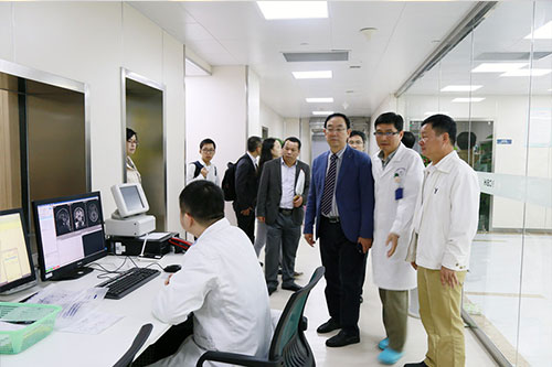 在負(fù)一樓考察時(shí),影像科孫海輝主任向調(diào)研組領(lǐng)導(dǎo)們介紹了飛利浦3.0T核磁共振的特點(diǎn)和優(yōu)勢,在得知3.0T核磁共振檢查一次收費(fèi)500元左右時(shí),黃秘書長很是驚訝,他說在廈門同樣的檢查要貴上好多。
