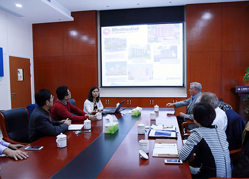 院內(nèi)考察結(jié)束后來(lái)訪團(tuán)一行舉行了交流會(huì),卓總將醫(yī)院的院史院貌、專家團(tuán)隊(duì)、設(shè)施設(shè)備、學(xué)科建設(shè)和重點(diǎn)遠(yuǎn)景規(guī)劃等向來(lái)訪團(tuán)作了詳細(xì)介紹。接著,David Baytos先生介紹了美國(guó)美圣迪斯醫(yī)療集團(tuán)概況、經(jīng)營(yíng)理念以及精益化管理,并高度贊譽(yù)我院規(guī)劃設(shè)計(jì)理念超前,管理科學(xué)規(guī)范,對(duì)全數(shù)字化的先進(jìn)設(shè)備設(shè)施稱贊有加;觀察細(xì)致的Linda Lin女士還特別提到說(shuō),她在我院看到醫(yī)護(hù)人員都是始終保持著微笑服務(wù),傳遞出員工們樂(lè)業(yè)敬業(yè)而發(fā)自內(nèi)心的自豪感,讓給她留下了很好的印象。卓總感謝 David Baytos先生一行為我們分享了美國(guó)現(xiàn)代醫(yī)院管理運(yùn)營(yíng)的經(jīng)驗(yàn),他說(shuō)尋求國(guó)際化合作是我院的戰(zhàn)略目標(biāo),藍(lán)十字醫(yī)院高端醫(yī)療領(lǐng)域進(jìn)行更多嘗試。希望通過(guò)與美國(guó)美圣迪斯醫(yī)療在醫(yī)院管理、人才培養(yǎng)、學(xué)術(shù)交流、技術(shù)培訓(xùn)、科研合作等領(lǐng)域的深度合作,特別在遠(yuǎn)程會(huì)診、疑難病轉(zhuǎn)診和美國(guó)專家到我院指導(dǎo)及我院派醫(yī)生赴美學(xué)習(xí)等提出自己的想法。整場(chǎng)交流活動(dòng)氣氛活躍,有問(wèn)有答,翻譯忙得不亦樂(lè)乎。David Baytos先生真誠(chéng)期待能與我院成為戰(zhàn)略合作伙伴,共同努力將上海藍(lán)十字腦科醫(yī)院打造成一所現(xiàn)代化、國(guó)際化、專業(yè)化的腦科?漆t(yī)院。