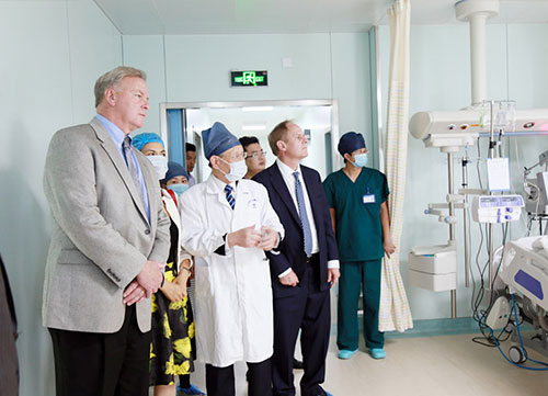 在醫(yī)院領(lǐng)導(dǎo)的陪同下,來(lái)訪團(tuán)一行深入我院全數(shù)字化復(fù)合手術(shù)室、ICU重癥監(jiān)護(hù)室、神經(jīng)內(nèi)、外科病區(qū)、美國(guó)尼高力腦電監(jiān)測(cè)室、神經(jīng)康復(fù)醫(yī)學(xué)科、醫(yī)學(xué)影像科和高壓氧科等重點(diǎn)臨床特色科室與功能科室考察,隨行翻譯人員將院領(lǐng)導(dǎo)的介紹即時(shí)傳遞給外國(guó)友人,David Baytos 先生等人對(duì)我院完善的就診流程、先進(jìn)高精的設(shè)備、潔靜優(yōu)雅的就醫(yī)環(huán)境等相當(dāng)滿意,均豎起大拇指,“OK、Good”聲不斷。