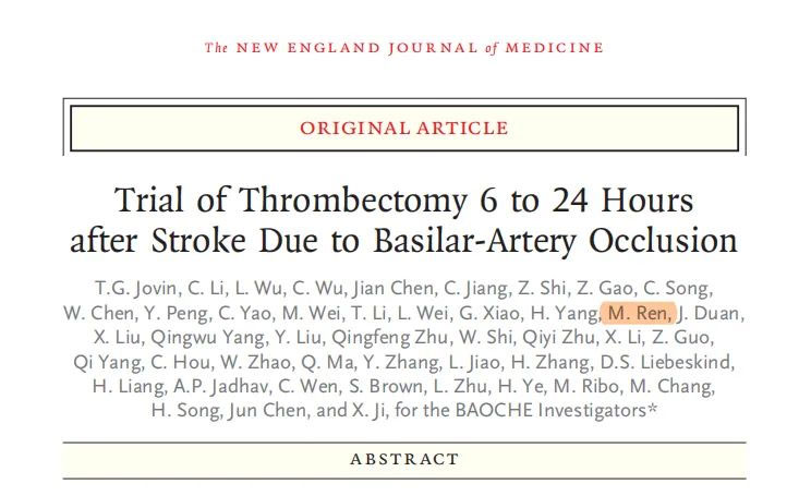 近日,上海藍(lán)十字腦科醫(yī)院科研工作再傳喜報——我院任明教授團(tuán)隊作為研究分中心參與由首都醫(yī)科大學(xué)宣武醫(yī)院吉訓(xùn)明教授牽頭發(fā)起的多中心、隨機(jī)對照臨床研究—中國急性基底動脈閉塞血管內(nèi)治療臨床試驗(BAOCHE)研究結(jié)果于2022年10月13日正式發(fā)表在國際頂級醫(yī)學(xué)期刊《新英格蘭醫(yī)學(xué)雜志》。