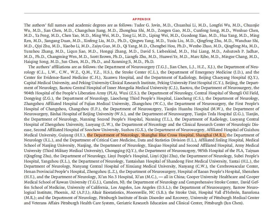 ▲ 論文作者單位:the Department of Neurology, Shanghai Blue Cross Hospital, Shanghai (M.R.)/上海藍(lán)十字腦科醫(yī)院神經(jīng)內(nèi)科