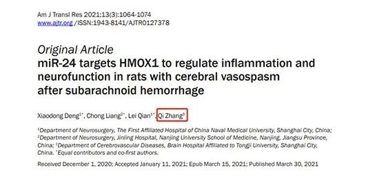 腦血管病科主任張琪博士在專業(yè)學(xué)術(shù)期刊American Journal of Translational Research 《美國轉(zhuǎn)化研究雜志》發(fā)表的《miR-24靶向HMOX1調(diào)節(jié)蛛網(wǎng)膜下腔出血后腦血管痙攣大鼠炎癥和神經(jīng)功能》成功被SCI收錄,影響指數(shù)為3.279。目前,張琪博士上海市衛(wèi)健委課題“AIBP在靜脈高壓相關(guān)性腦病進(jìn)展中的作用研究”順利結(jié)題,依托課題發(fā)表SCI論文4篇,申請專利2項,順利完成所有項目任務(wù)。
