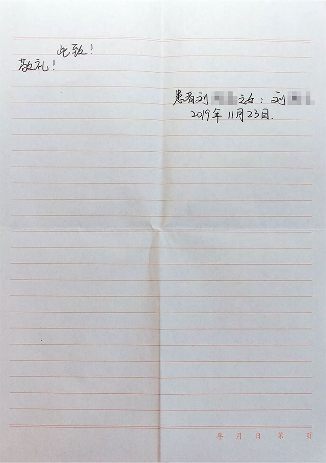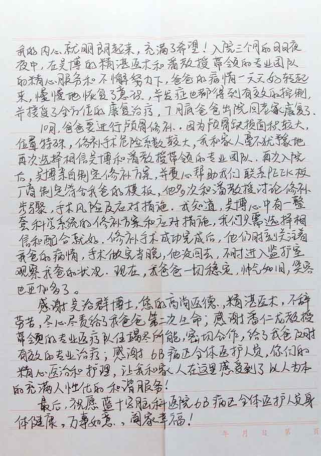患者腦外傷嚴(yán)重,多次面臨生命的危險(xiǎn),但每一次患者都在醫(yī)護(hù)團(tuán)隊(duì)專(zhuān)業(yè)治療與精心護(hù)理下轉(zhuǎn)危為安,患者及其家屬因此非常感動(dòng),尤其是患者女兒,她親歷了父親治療的整個(gè)過(guò)程。為了表示感謝,患者女兒給6B病區(qū)醫(yī)護(hù)團(tuán)隊(duì)送來(lái)了兩面錦旗,而這次顱骨修補(bǔ)手術(shù)后,她更是寫(xiě)了兩頁(yè)滿(mǎn)滿(mǎn)的感謝信,每一字、每一句、每一段,訴說(shuō)這感動(dòng)與真情。(現(xiàn)附感謝信原文)感謝信