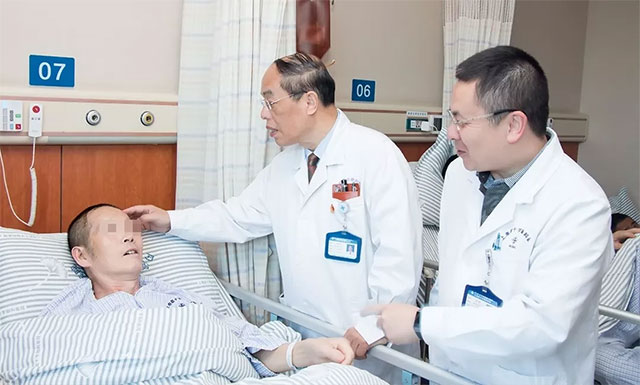 然而讓我們手無(wú)足措的是爸爸轉(zhuǎn)院的第二天原頭部創(chuàng)口裂開(kāi),腦組織外溢,情況緊急。隨即潘仁龍教授帶領(lǐng)團(tuán)隊(duì)緊急會(huì)診,商量進(jìn)一步的手術(shù)方案,并為我們介紹了本次的主治醫(yī)師吳治群博士。吳博士在全面了解爸爸的病情后,制定了完善周密的手術(shù)方案,緊接著是7個(gè)多小時(shí)的二次手術(shù),手術(shù)在吳博士及其團(tuán)隊(duì)的專(zhuān)業(yè)操作下順利完成。術(shù)后第二天,爸爸睜開(kāi)了眼睛,盡管他意識(shí)還未恢復(fù),但這給了我們?nèi)胰诵判暮拖M抑肋@次我們遇到了專(zhuān)業(yè)的醫(yī)護(hù)團(tuán)隊(duì)和認(rèn)真負(fù)責(zé)的醫(yī)生。