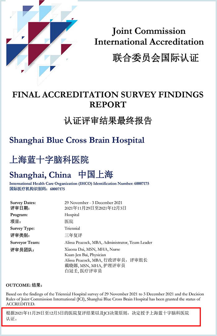 12月13日,上海藍(lán)十字腦科醫(yī)院接獲美國(guó)芝加哥國(guó)際醫(yī)療衛(wèi)生機(jī)構(gòu)認(rèn)證聯(lián)合委員會(huì)總部正式通知,祝賀醫(yī)院以9.89的高分,第二次通過(guò)了國(guó)際JCI(第七版)認(rèn)證評(píng)審。
