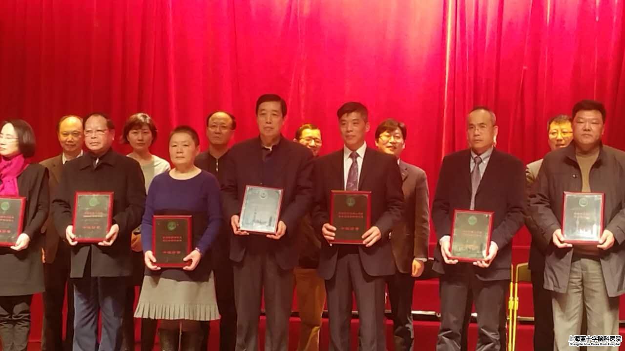 上海藍(lán)十字腦科醫(yī)院新院副院長(zhǎng)袁士宗教授(前排左4)上臺(tái)接受獎(jiǎng)牌