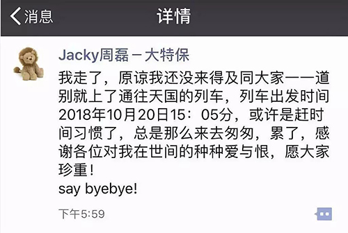 “我走了,原諒我還沒來得及同大家一一道別就上了通往天國的列車,列車出發(fā)時間2018年10月20日15:05分,或許是趕時間習(xí)慣了,總是那么來去匆匆,累了,感謝各位對我在世間的種種愛與恨,愿大家珍重!say byebye!”