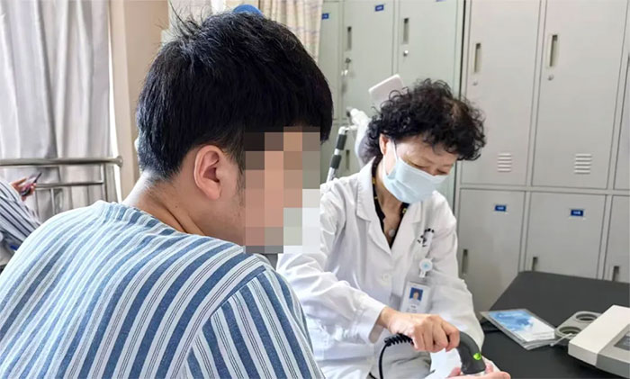 康復醫(yī)學科沈志祥博士和主管康復治療師張雁老師詳細了解患者致病損傷、診療過程,客觀評估病情:患者因皮膚和皮下組織局部感染、肺部感染和持續(xù)發(fā)熱(高達40℃)等多重不利因素,只能坐輪椅及躺臥;手功能評定:右手指肌腱斷裂術(shù)后,雖然傷口愈合良好,但手指腫脹、疼痛、僵直,屈伸功能嚴重受限,斷指(右中指、環(huán)指)屈伸范圍:0-5°;颊叱掷m(xù)發(fā)熱、手指疼痛、功能嚴重受限,給康復治療帶來了重重困難。