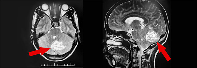 ▲ MRI檢查顯示,該小腦腫瘤有明顯的“虎紋征”