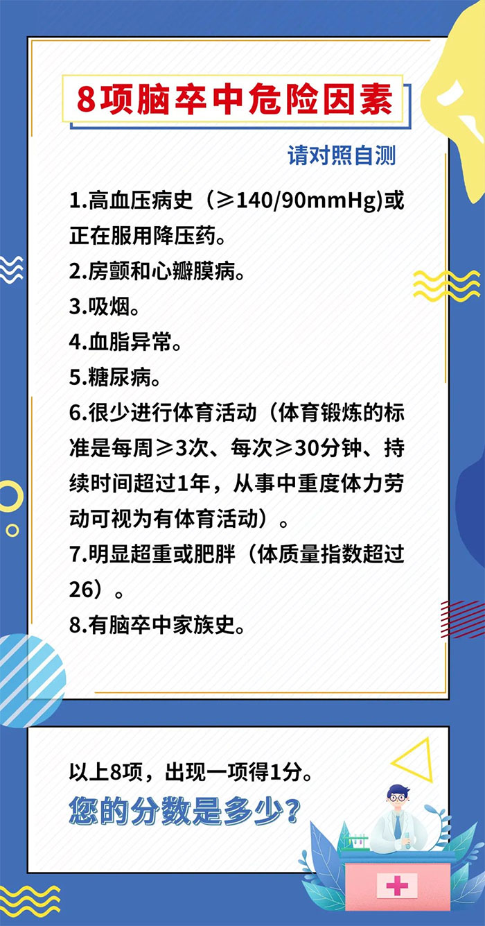 李振并主任表示,臨床上約九成腦卒中的發(fā)生,與其危險因素密切相關(guān)。大家可以進(jìn)行簡單的自我測評,了解自身是否存在腦卒中危險因素,并在日常生活中有針對性地進(jìn)行預(yù)防。