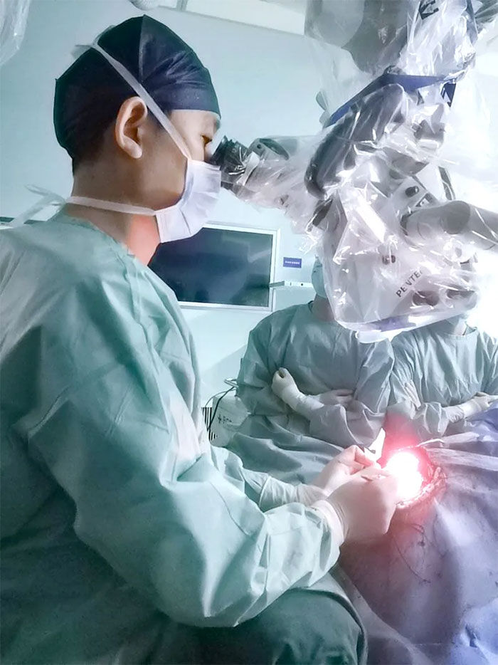 腦部外科手術(shù)本身就是極度復(fù)雜和精細(xì)的,往往“牽一發(fā)”就“動(dòng)全身”。而由于患者顱內(nèi)血管神經(jīng)密集,手術(shù)過程中的細(xì)微失誤,都可能出現(xiàn)血管出血、神經(jīng)損傷,造成患者的神經(jīng)功能障礙。張琪博士在劉春醫(yī)生、李喆醫(yī)生協(xié)助下,在顯微鏡下將顱外顳淺動(dòng)脈游離后引入顱內(nèi),采用只有頭發(fā)絲直徑1/3的11-0吻合針線,與直徑只有1mm左右的大腦中動(dòng)脈終支角回動(dòng)脈行端側(cè)吻合。張琪博士像繡花一樣,在10倍的顯微鏡下一點(diǎn)點(diǎn)地完成了精細(xì)操作。經(jīng)過12針縫合,最終顳淺動(dòng)脈和大腦中動(dòng)脈成功吻合。縫合后先撤出遠(yuǎn)端阻斷夾無滲血,隨后撤出近端阻斷夾,血管吻合良好,無出血,以吲哚箐綠靜脈造影后見搭橋血管血流通暢,搭橋成功。整個(gè)手術(shù)持續(xù)5個(gè)多小時(shí)。術(shù)后,患者病情穩(wěn)定,神志清楚,言語流利,肢體活動(dòng)顯著改善。目前,王先生正在康復(fù)中。
