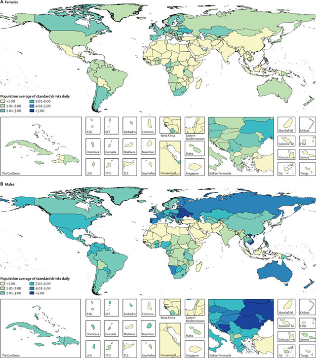 ▲ 《柳葉刀》:因酒精導(dǎo)致死亡人數(shù)國家排行(男右女左)