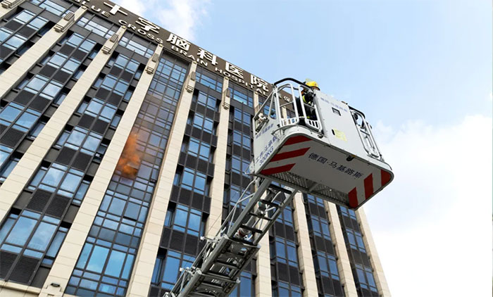 ▲ 醫(yī)院與七寶救援站聯(lián)合開展高樓層火災(zāi)受困人員解救演練