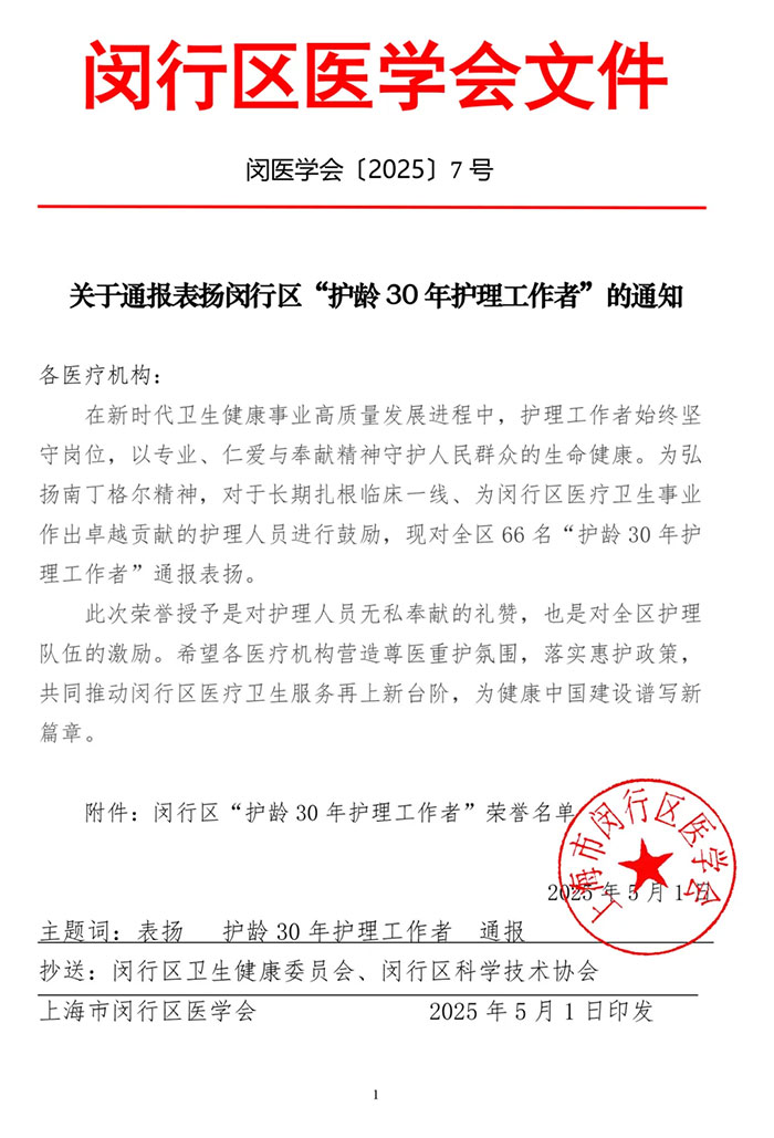 醫(yī)院護(hù)理部副主任閻友芬、急診科護(hù)士長(zhǎng)潘水云懷抱守護(hù)患者生命健康的初心,在護(hù)理崗位上堅(jiān)守30年以上,把人生最美好的青春歲月無私奉獻(xiàn)給了護(hù)理事業(yè),榮獲閔行區(qū)“護(hù)齡30年護(hù)理工作者”稱號(hào)。她們是天使,是南丁格爾“提燈女神”的傳承者,她們的精神值得我們學(xué)習(xí)和發(fā)揚(yáng)。