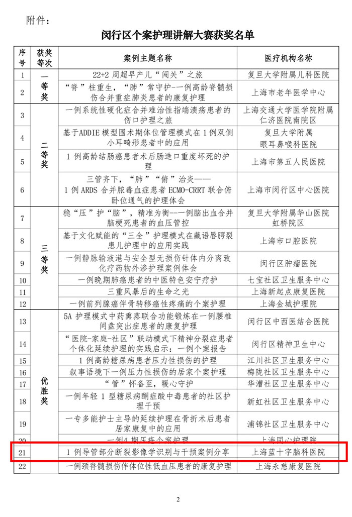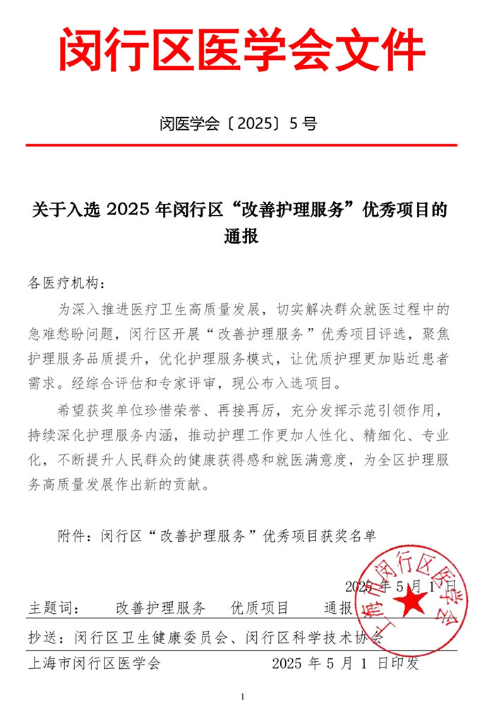 為深入推進(jìn)醫(yī)療衛(wèi)生高質(zhì)量發(fā)展,切實(shí)解決群眾就醫(yī)過程中的急難愁盼問題,閔行區(qū)開展“改善護(hù)理服務(wù)”優(yōu)秀項(xiàng)目評(píng)選,聚焦護(hù)理服務(wù)品質(zhì)提升,優(yōu)化護(hù)理服務(wù)模式,讓優(yōu)質(zhì)護(hù)理更加貼近患者需求。經(jīng)綜合評(píng)估和專家評(píng)審,醫(yī)院《構(gòu)建“八線一體”重癥專科護(hù)理人才培養(yǎng)模式》項(xiàng)目最終獲得二等獎(jiǎng)。