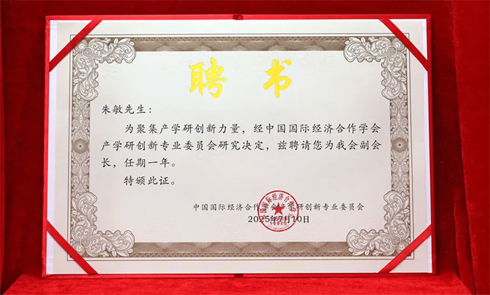 ▲ 中國國際經濟合作學會產學研創(chuàng)新專業(yè)委員會副會長單位及副會長榮譽牌匾/證書