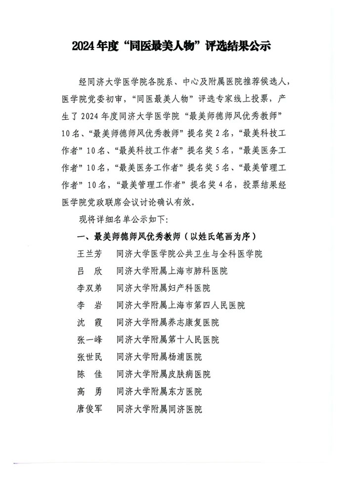 近日,中共同濟(jì)大學(xué)醫(yī)學(xué)院委員會(huì)開展的2024年度“同醫(yī)最美人物”評選結(jié)果揭曉。2024年度“同醫(yī)最美人物”評選工作經(jīng)中共同濟(jì)大學(xué)醫(yī)學(xué)院委員會(huì)審議決定,在各院系、中心及附屬醫(yī)院中產(chǎn)生“最美師德師風(fēng)優(yōu)秀教師”10名、提名獎(jiǎng)2名,“最美科技工作者”10名、提名獎(jiǎng)5名,“最美醫(yī)務(wù)工作者”10名、提名獎(jiǎng)5名,“最美管理工作者”10名、提名獎(jiǎng)4名。