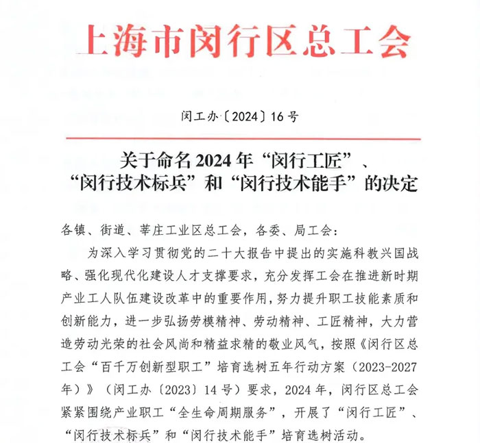 為深入學(xué)習(xí)貫徹黨的二十大報(bào)告中提出的實(shí)施科教興國戰(zhàn)略、強(qiáng)化現(xiàn)代化建設(shè)人才支撐要求,充分發(fā)揮工會(huì)在推進(jìn)新時(shí)期產(chǎn)業(yè)工人隊(duì)伍建設(shè)改革中的重要作用,努力提升職工技能素質(zhì)和創(chuàng)新能力,進(jìn)一步弘揚(yáng)勞模精神、勞動(dòng)精神、工匠精神,大力營造勞動(dòng)光榮的社會(huì)風(fēng)尚和精益求精的敬業(yè)風(fēng)氣,按照《閔行區(qū)總工會(huì)“百千萬創(chuàng)新型職工”培育選樹五年行動(dòng)方案(2023-2027年)》(閔工辦(2023)14號(hào))要求,2024年,閔行區(qū)總工會(huì)緊緊圍繞產(chǎn)業(yè)職工“全生命周期服務(wù)”,開展了“閔行工匠”“閔行技術(shù)標(biāo)兵”和“閔行技術(shù)能手”培育選樹活動(dòng)。