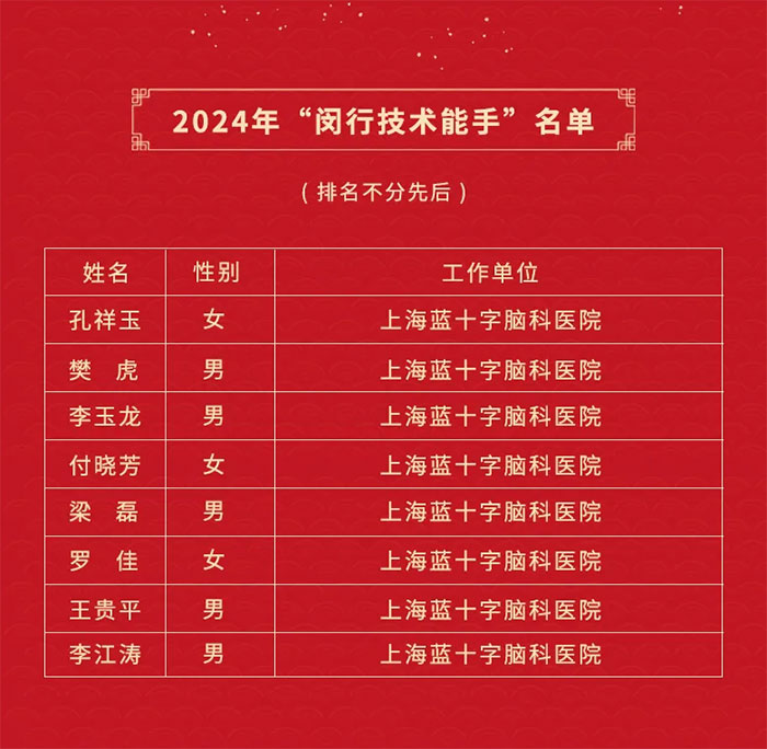 近日,閔行區(qū)總工會(huì)公布了2024年“閔行工匠”、“閔行技術(shù)標(biāo)兵”和“閔行技術(shù)能手”名單,上海藍(lán)十字腦科醫(yī)院【同濟(jì)大學(xué)附屬上海藍(lán)十字腦科醫(yī)院(籌)】孔祥玉、樊虎、李玉龍、付曉芳、梁磊、羅佳、王貴平、李江濤等9名職工入選“閔行技術(shù)能手”。