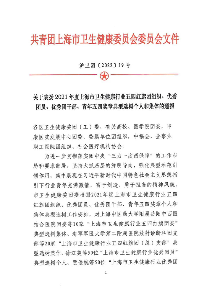11月10日,市衛(wèi)生健康委團(tuán)委通報(bào)表?yè)P(yáng)2021年度上海市衛(wèi)生健康行業(yè)五四紅旗團(tuán)組織、優(yōu)秀團(tuán)員、優(yōu)秀團(tuán)干部、青年五四獎(jiǎng)?wù)碌湫瓦x樹個(gè)人和集體。上海藍(lán)十字腦科醫(yī)院團(tuán)支部榮獲“2021年度上海市衛(wèi)生健康行業(yè)五四紅旗團(tuán)(總)支部”稱號(hào)。