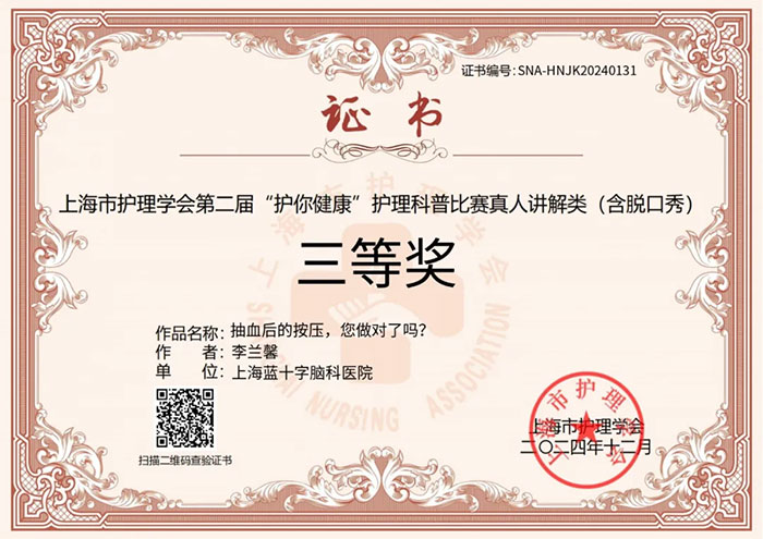 經(jīng)過激烈角逐,上海藍(lán)十字腦科醫(yī)院【同濟(jì)大學(xué)附屬上海藍(lán)十字腦科醫(yī)院(籌)】精心選送的參賽作品《抽血后的按壓,您做對了嗎?》(作者:李蘭馨)榮獲上海市護(hù)理學(xué)會(huì)第二屆“護(hù)你健康”護(hù)理科普比賽真人講解類(含脫口秀)三等獎(jiǎng)。